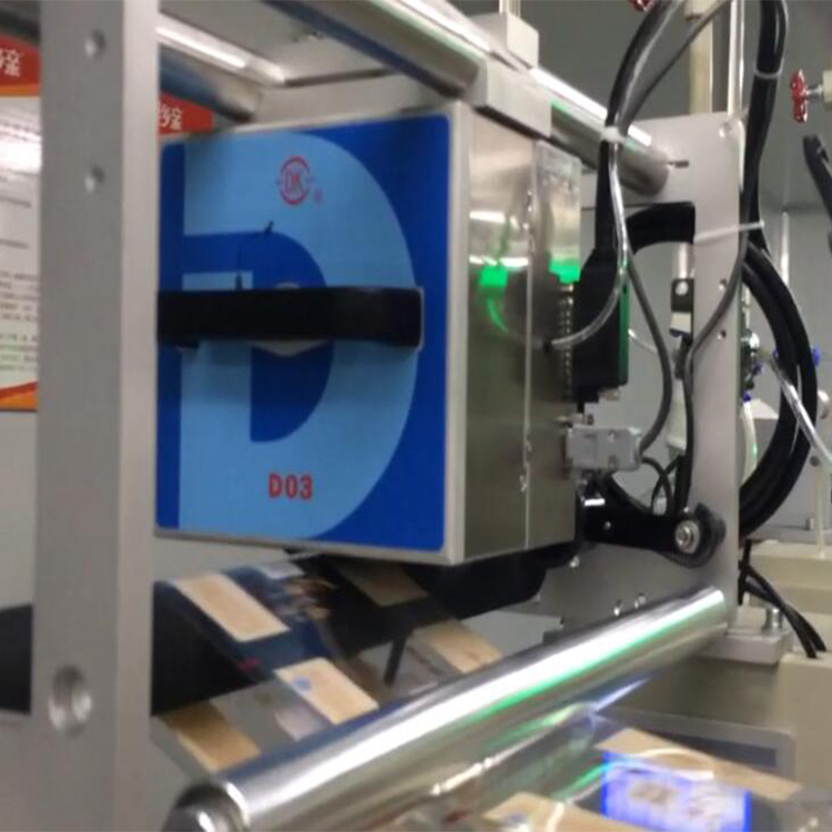 打碼時,打印頭與包裝膜有一個相對運動,在連續(xù)式包裝機上,包裝膜運行時 ,打印頭快速地壓在包裝膜上,打印出內(nèi)容。完成一次動作后自動彈起復(fù)位,準(zhǔn)備打下一袋。